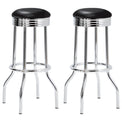 Channel the charm of a classic soda shop with this vintage-style swivel bar stool. A cushioned black leatherette seat crowns the top, resting on a polished electroplated chrome base with ribbed apron detailing. The flared legs and circular footrest reinforce the retro aesthetic while offering stability and ease. Crafted from heavy gauge metal with smooth 360-degree swivel, this nostalgic piece combines comfort, durability, and timeless appeal.