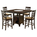 | Appreciate the texture and dimension created with gris lattice details in a charming five-piece transitional counter height dining set. A rich cappuccino finish pairs with soft tan upholstery to create a neutral palette, perfect for creating a warm and welcoming ambiance in your kitchen or dining room. The set centers on a square dining table that includes a lower shelf and cabinet, offering multifunctional appeal that maximizes space utilization. The cabinet includes stemware and bottle storage to keep favorite vintages at your fingertips while enjoying delicious meals with friends and family. Chairs includes full backs and footrests for excellent support and comfort, while the open cube design lightens the overall look while ensuring rich dimensionality. | ||