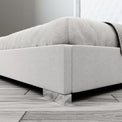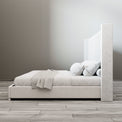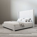 Laura Bed brings elegant modern design without sacrificing soft touches. This beautiful bed sits proudly as a focal point in a primary suite, featuring a captivating tall headboard. Its solid platform build offers a minimalist look, while charming headboard tufting adds decorative accents. A French white velvet captures a modern aesthetic that retains its versatility. This fashionable bed invites a creative selection of custom linens to keep the grand design.