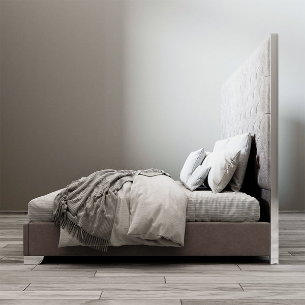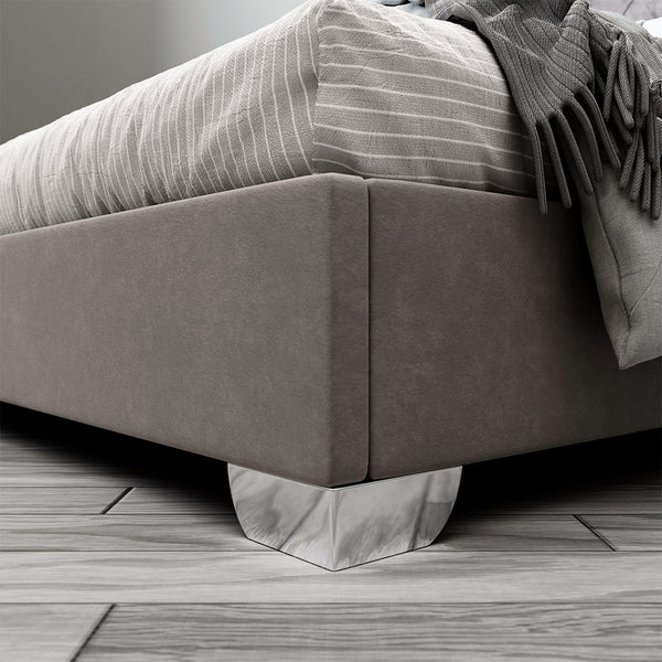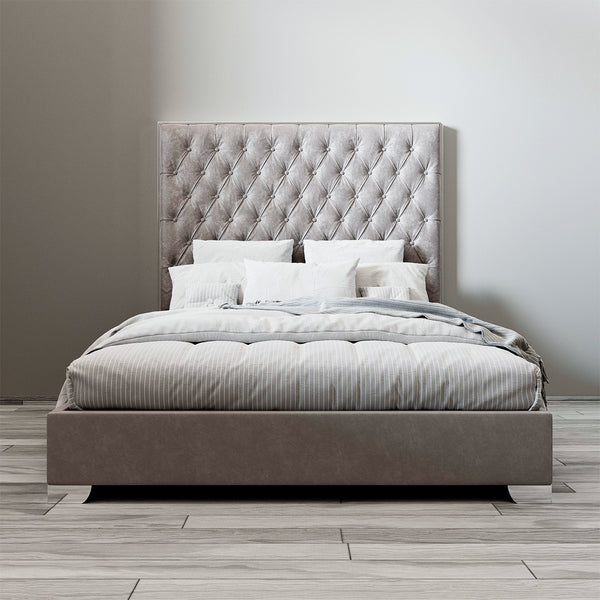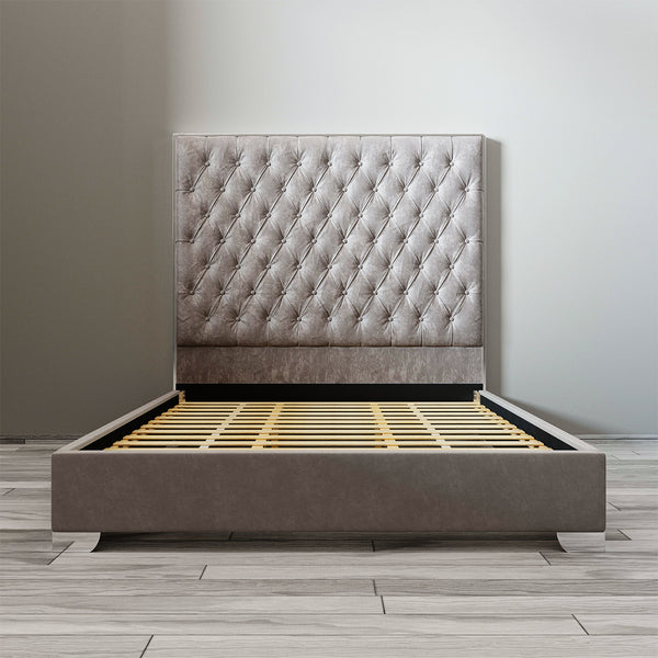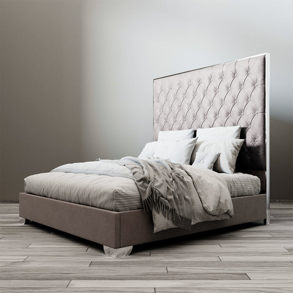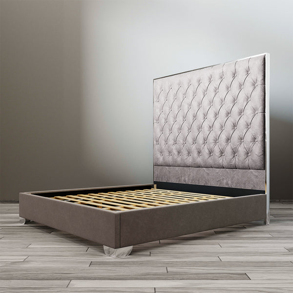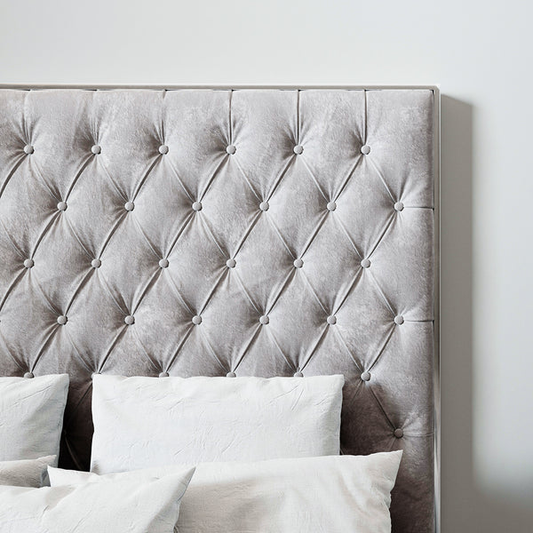 Bella bed combines deep button tufted luxurious velvet upholstery and steel, the old and the new. The headboard is edged with polished steel in a radiant silver color. Upholstered with luxurious Salvador velvet, the headboard is finished with deep button tufting. It adds warmth to your most modern spaces and blends in with all your traditional decors. Strong and sturdy to give you long-lasting comfort.