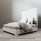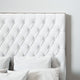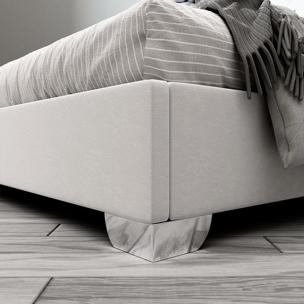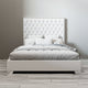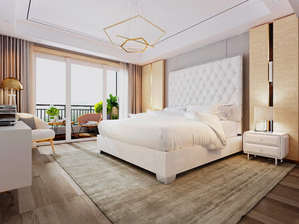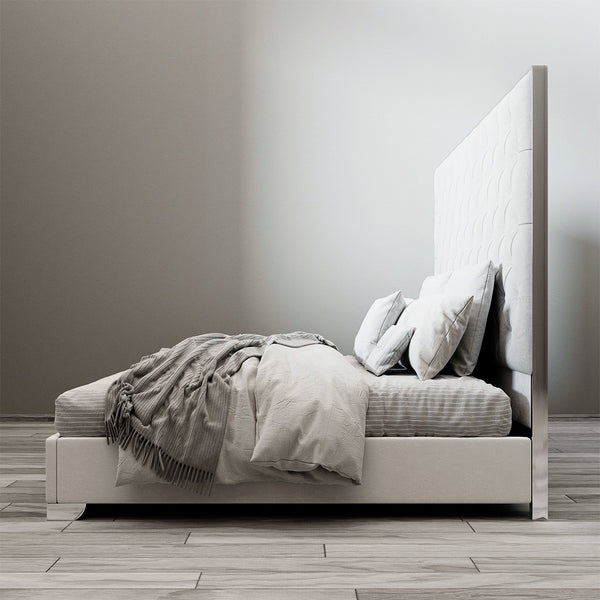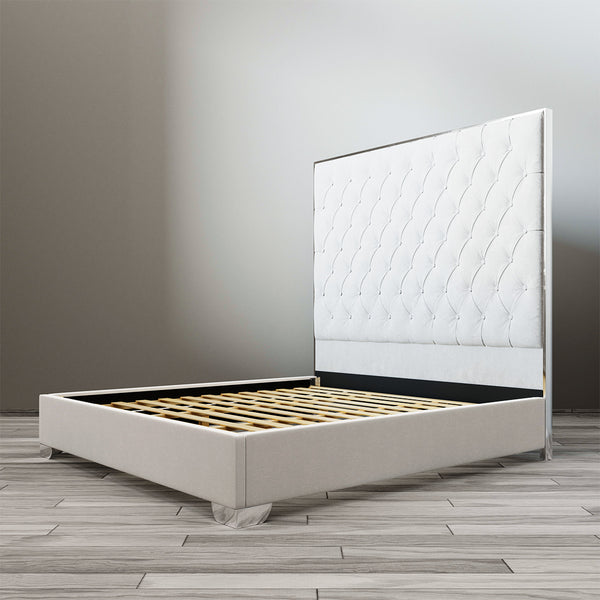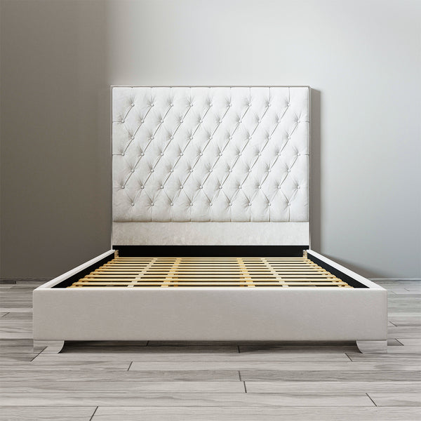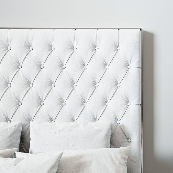 The Bride bed combines deep button tufted luxurious White French velvet upholstery and steel, the old and the new. The headboard is edged with polished steel in radiant silver, upholstered with luxurious French velvet, and finished with deep button tufting. It adds warmth to your most modern spaces and blends in with all your traditional decors. Strong and sturdy to give you long-lasting comfort.